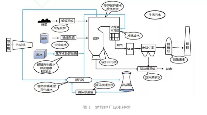 1 燃煤电厂废水种类及处理回用方式;燃煤电厂用水分为工业用水和生活用水。